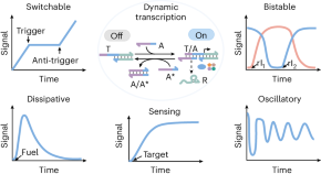 • Emulating biological transcription using artificial synthetic circuits is a key challenge in advancing systems chemistry. This Review discusses synthetic transcription circuits that are dynamically triggered to drive switchable, dissipative, oscillatory and bistable reaction models, mimicking native processes. These circuits are proposed as critical machineries for sensing and theragnostics.
