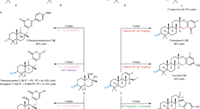 In nature, terpenes are made by forming isoprene chains and then folding the chains into carbocycles, followed by oxidation and rearrangement reactions. Now, inspired by nature, a range of polycyclic terpene structures are synthesized from phenols through a three-step sequence of prenylation, dearomatization and/or prenyl migration, and then epoxidation and/or radical cyclization. Several total syntheses of natural products are carried out using this approach.