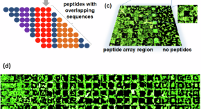 Peptide arrays are used in areas such as measuring protein-protein interactions, but achieving high density in synthesis is challenging. Here, the authors report a method for the combinatorial synthesis of high density peptides arrays by laser driven sequential transfer of monomers onto acceptor surfaces.