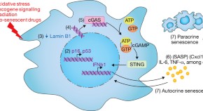Cellular senescence, a cell-autonomous growth arrest program, also executes pleiotropic non-cell-autonomous activities through the senescence-associated secretory phenotype (SASP). The innate cGAS–STING DNA-sensing pathway is now shown to regulate senescence by recognizing cytosolic DNA and inducing SASP factors, uncovering an unexpected link between these two previously unrelated pathways.