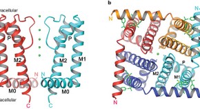 Channel gating in tetrameric cation channels occurs as structural transitions that involve straightening and bending of inner helices at a conserved glycine residue. Structural representatives of these closed and opened states have come from crystal structure of KcsA and MthK, respectively. The structure of NaK in the open state, when combined with a previously determined structure of NaK in the closed state, allows the detailed analysis of channel gating within the same channel.