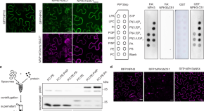 NPH3 is required for auxin-dependent plant phototropism. Here Reuter et al. show that NPH3 is a plasma membrane-bound phospholipid-binding protein and that in response to blue light, NPH3 is phosphorylated and associates with 14-3-3 proteins which leads to dissociation from the plasma membrane.