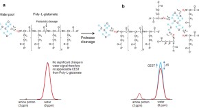 Kejia Cai et al. describe a method to non-invasively detect glutamate (Glu) concentrations in the brain with MRI at high resolution. The approach is based on the pH-dependent chemical exchange saturation transfer (CEST) effect between the amino group of Glu and bulk water and offers advantages over proton magnetic resonance spectroscopy. Feasibility of GluCEST was demonstrated in rat brain after middle cerebral artery occlusion stroke and in a rat brain tumor model, as well as in healthy human brain at 7 Tesla.