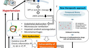 Schematic presentation of possible mechanisms of hypertensive dementia, including amyloid beta metabolism (A), NVU dysfunction (B), vulnerability of the hippocampus (C), and activation of RAS (D), and possible new therapeutic approaches for discovering antihypertensive drugs with anti-dementia actions (E). See text for details. Aβ, amyloid β; APP, amyloid β precursor protein; BACE1, β-site amyloid precursor protein cleaving enzyme 1; BBB, blood-brain barrier; CBF, cerebral blood flow; eNOS, endothelial nitric oxide synthase; FDA, Food and Drug Administration; IL, interleukin; NOX, NADPH oxidase; NVU, neurovascular unit; RAS, renin-angiotensin system; ROS, reactive oxygen species.