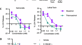 The small molecule muscimol blocks oligomerization of ninjurin-1, which is required for plasma membrane rupture downstream of gasdermin D pore formation during pyroptotic lysis, and reduces lethality in mice during LPS-induced septic shock.
