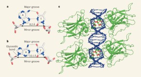 The question of how proteins recognize specific DNA sequences in the face of vastly higher concentrations of non-specific DNA remains unclear. One suggested mechanism involves the formation of hydrogen bonds with specific bases, primarily in the major groove. The comprehensive analysis of the three-dimensional structures of protein–DNA complexes now shows that the binding of arginine residues to narrow minor grooves is a widely used mode for protein–DNA recognition.
