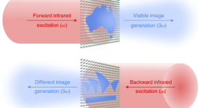Asymmetric parametric generation of light in nonlinear metasurfaces is enabled by nonlinear dielectric resonators in translucent metasurfaces. Upon infrared illumination, different and independent visible light images are detected for ‘forwards’ versus ‘backwards’ operation.