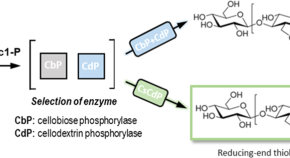 • Cellulose chains with a reducing-end thiol group are of interest to install a controllable topochemical pattern of site-selective modification into nanocellulose materials. Selection of the polymerizing enzyme (cellodextrin phosphorylase; CdP) was pursued here to enhance the synthetic precision in the preparation of 1-thio-cellulose. The CdP from Clostridium stercorarium (CsCdP) was identified as a practical catalyst for 1-thio-cellulose synthesis in high purity (≥95%) directly from β-1-thio-glucose. The synthesis proceeds without the need of cellobiose phosphorylase (CbP) and minimizes the contamination (plain cellulose; ≤5%) in the product.