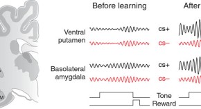 • Projections from the amygdala to the ventral striatum are important for learning. A study finds that fleeting epochs of coherent gamma oscillations between these brain areas may be important for reinforcement learning.