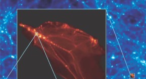 A two-dimensional spectroscopic investigation of a large, luminous filament of the cosmic web near QSO UM287 reveals that the brightest emission region is an extended rotating hydrogen disk with a velocity profile that is characteristic of gas in a 1013-solar-mass dark-matter halo, with a geometry that is strongly suggestive of cold flow accretion.
