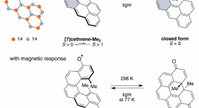 • Open-shell nanographenes are promising for quantum technologies, but their magnetic stability has remained limited by weak exchange coupling. Now, two large rhombus-shaped nanographenes with zigzag peripheries, one with 48 carbon atoms and the other with 70, have been synthesized on gold and copper surfaces. The 70-carbon compound exhibits a large magnetic exchange coupling exceeding 100 meV.