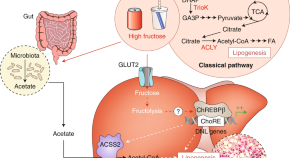 Fructose, a monosaccharide derived from fruits, is primarily consumed in a form combined with glucose as sugar or as a component of high-fructose corn syrup added as a sweetener to processed foods and carbonated beverages. Increased consumption of fructose has emerged as a major contributor to non-alcoholic fatty liver disease, dyslipidaemia, insulin resistance and diabetes. Now Zhao et al. show that hepatic lipid synthesis is increased by fructose metabolism in both the liver and intestine.