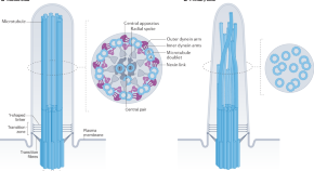 Intraflagellar transport (IFT) ensures delivery of selected proteins into cilia. The IFT protein complexes IFT-A and IFT-B polymerize at the base of the cilium to form an anterograde train that facilitates cargo import, whereas remodelling into a retrograde train at the ciliary tip enables cargo export.
