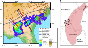 The Central Atlantic Magmatic Province is the most aerially extensive magmatic event in Earth’s history, yet few constraints exist on the volumes of intrusions at depth. Here, the authors find limited intrusive volumes beneath the South Georgia Rift, consistent with modest potential mantle temperatures (<1500 °C) related to syn-rift decompression melting.