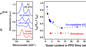 Preparation and characterization of poly(2,6-dimethyl-1,4-phenylene)oxide (PPO) films exhibiting the cocrystalline phase with carvacrol, a relevant natural antimicrobial, are reported. The relative intensity and linear dichroism of two O–H out-of-plane deformation peaks (at 698 and 717 cm−1) of carvacrol can be rationalized by assuming that these peaks are due to isolated and hydrogen-bonded guest molecules, respectively, and by slower desorption of carvacrol when included as isolated molecules in the cavities of the polymer host crystalline phase.