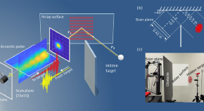 Optical non-line-of-sight imaging demands ultrafast detectors and suffers steep power loss, limiting range and practicality. Here, the authors realize a phase-sensitive synthetic-aperture ultrasound platform that exploits specular wall reflections and f-k migration to reconstruct 3D hidden scenes with 1 cm lateral resolution at meter-scale ranges, attaining performance comparable to optical approaches with low-power, eye-safe hardware.