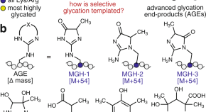 Advanced glycation end-products (AGEs), such as methylglyoxal-derived hydroimidazolone isomer (MGH-1), are associated with disease and age-related disorders, and occur spontaneously, so it is unclear why specific protein sites become modified with specific AGEs. Here, the authors use a combinatorial peptide library to determine the chemical features that favour MGH-1 formation for short peptides and demonstrate a key role of tyrosine in this process.
