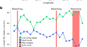 • Analysing a global dataset of >24,000 observations of coral reef benthic cover, the authors show that high macroalgal cover is largely restricted to the Western Atlantic, where alongside the Central Pacific there have also been marked declines in coral cover since the late 1990s.