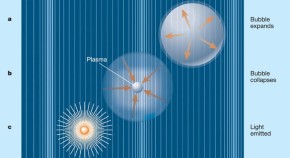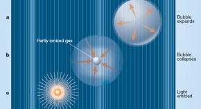 In sonoluminescence, intense sound waves in water cause bubbles to form, which then collapse emitting a brief flash of light. We know that the collapse heats the trapped gas, but not why light is emitted. A technique that could help answer this question is laser-induced bubble collapse, in which much bigger bubbles are produced. Time-resolved measurements of the flash have been used to constrain emission mechanisms — for example, if it is ordinary thermal radiation, the central temperature in the bubble must be at least 70,000 K.