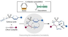1,3-Dipolar cycloadditions are well-known transformations in organic synthesis. However, the reactivity of benzene rings in these processes is underexplored. In situ-generated diazoalkenes have now been shown to undergo intramolecular 1,3-dipolar cycloadditions with aromatic rings. The transformation results in an unaromatized benzene ring that enables the synthesis of functionalized heterocycles.