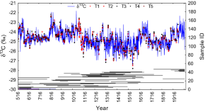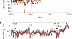 A large volcanic eruption in AD 1258–1259 is expected to have caused substantial climate cooling, but evidence for this effect is absent from tree-ring-based temperature reconstructions. Numerical modelling of tree growth shows that the lack of cooling is probably an artefact caused by low sensitivity to cooling in trees growing near the treeline.