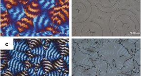 Atomic force microscopy (AFM) phase images for the ridge and valley regions of the water-etched poly(ethylene oxide)/poly(L-lactic acid) (50/50) blend crystallized at crystallization temperature (Tc)=110 °C. The AFM graph (5 μm×5 μm) of the ridge region b shows a texture different from that of the valley region c. The surface patterns of the lamellae in the valley and ridge in these two regions appeared as flat-on and edge-on lamellae, respectively. The anisotropicity of the platelet crystals in these two regions was also apparently different. The orientation of the crystal lamellae in the valley (region c) was circumferential, whereas that of the lamellae in the ridge (region b) was radial. The difference in orientation in the ridge and valley regions may account for the cracks in the ridge regions but not in the valley region.