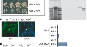 Light and gibberellins (GA) regulate multiple aspects of plant development, and this paper is one of two studies that provide molecular insights into the connection between these pathways. Without GA, DELLA proteins (GA-signalling repressors) interact with PIFs (phytochrome-interacting proteins) and inhibit their binding to gene promoters. GA triggers degradation of DELLA proteins, thereby allowing PIFs to bind to their target promoters and regulate gene expression. These results reveal a signalling cascade that contributes to coordinated plant growth regulation by light and gibberellins.