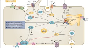 Although autosomal dominant polycystic kidney disease is the most common monogenic kidney disease worldwide, its pathogenic mechanisms are incompletely understood. In this Review, Vicente Torres and colleagues propose a hypothesis in which the disruption of calcium signalling that results from mutations inPKD1 or PKD2is perpetuated by the consequent dysregulation of cAMP and purinergic signalling, which magnifies the effect of vasopressin to further disrupt calcium signalling and activate downstream signalling pathways that cause impaired tubulogenesis, increased cell proliferation, increased fluid secretion and interstitial inflammation.