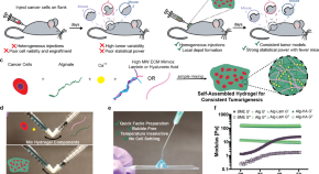 Grosskopf et al. report the development of a tumor inoculation method using self-assembled alginate hydrogels containing different tumorigenic molecules to reproducibly generate tumors in a subcutaneous murine tumor model. They show the impact of this improved model on the reduction of cohort size and increase in the power of the study design.