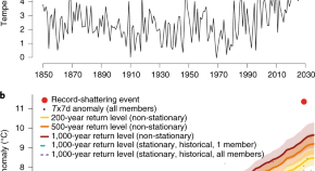 • Changes in extreme heat are often calculated as anomalies above a reference climatology. A different definition—week-day heatwaves surpassing the current record by large margins—shows that their occurrence probabilities depend on warming rate, not level, and are higher than during recent decades.