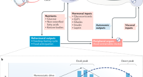 In this Review, Etienne Challet discusses the dual modulation of food intake by homeostatic and circadian processes, describes the mechanisms regulating feeding time and highlights the beneficial effects of correctly timed eating, as opposed to the negative metabolic consequences of mistimed eating.