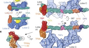 In eukaryotes, DNA replication depends on loading the ring-shaped helicase, Mcm2–7 onto double-stranded DNA and subsequent activation by GINS–Cdc45. Using single-particle EM reconstructions, the Mcm2–7 forms ring hexamers that are open between Mcm2 and Mcm5. When present, GINS and Cdc45 both seal off this gap. In the presence of a non-hydrolyzable ATP analog, two pores are formed. In this way, the complex could promote duplex opening and then segregate the two strands by partitioning them into the two pores.