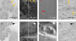 IMPORTANT information about the properties of the outermost layer of regolith on Phobos can be obtained from infrared thermal radiometry and spectrophotometry of the reflected radiation. From the analysis of Mariner 91,2, Viking 1,22–4 and ground-based experimental data it was concluded that the surface layer of Phobos consists of fine-grained material (regolith) 1 with a composition close to that of carbonaceous chondrites2,3. In the course of these measurements, Phobos was observed as a point-like object. Here we present results obtained with a resolution 1/20–1/40 of the mean Phobos diameter showing, for the first time, inhomogeneities in the thermal and spectral properties of the surface of Phobos.