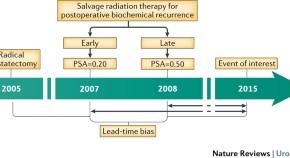 Early use of salvage radiotherapy in patients with prostate cancer with biochemical recurrence after radical prostatectomy has consistently been shown to provide better oncological outcomes than late use. However, the corresponding scientific literature might be subject to lead-time bias, given that in virtually all the available comparative studies, investigators calculated the survival period of included patients from the time of salvage radiotherapy — instead of from the time of radical prostatectomy.