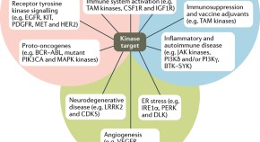 Existing kinase inhibitor drugs predominantly target receptor tyrosine kinases in cancer. Here, Gray and Ferguson review novel kinase targets in oncology, degenerative diseases, inflammatory disorders and infectious diseases. Advances in medicinal chemistry, selectivity profiling and computer-aided drug design, which are enabling the design of improved kinase inhibitors, are discussed.