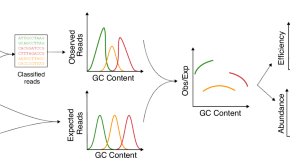 Differences in genomic GC content skew species abundances in microbial communities. Here, the authors develop GuaCAMOLE, a computational method that quantifies this GC bias from metagenomic sequencing data and corrects abundances accordingly, showing its application increases abundances of some pathogenic bacteria up to twofold in human gut microbiomes.