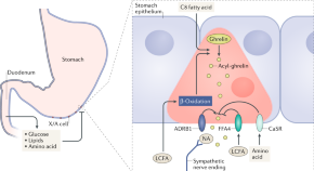Veprik et al. show that Acetyl-CoA-carboxylase 1 (ACC1), an enzyme that couples glucose metabolism to lipogenesis, is involved in glucagon secretion and regulates S-acylation of critical glucose-sensing proteins. Loss of ACC1 in pancreatic alpha-cells negatively affects both size and number, as well as glucagon content, while in gut enteroendocrine cells leads to reduced release of glucagon-like peptide 1.