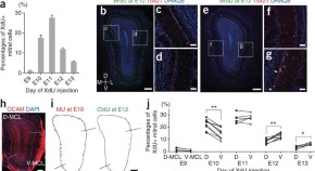 Although the olfactory receptor neurons converging onto the same glomeruli in the olfactory bulb are known, evidence for an olfactory map at cortical level is lacking. The current study finds that mitral cells that are born later during embryogenesis preferentially project to the olfactory tubercles as the late-born mitral cells tangentially migrate further on the axons of earlier born cells, forming an organization of neuronal projection into the olfactory cortex based on the timing of cell birth.