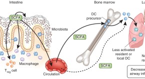 A new study in mice provides a link between dietary fiber intake, amounts of intestinal and systemic short-chain fatty acids, changes in the microbiome and allergic responses in the airways. The findings support the growing appreciation of a potential therapeutic role of diet in treating allergic diseases (pages 159–166).