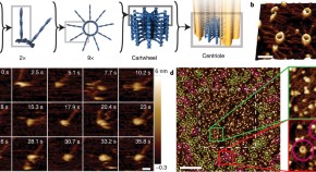Centriole biogenesis begins with self-assembly of SAS-6 proteins into 9-fold symmetrical ring polymers, which then stack into a cartwheel that scaffolds organelle formation. Here, the authors develop monobodies against Chlamydomonas reinhardtii SAS-6 and use X-ray crystallography, atomic force microscopy and cryo-electron microscopy to reveal insights into ring assembly and stacking.