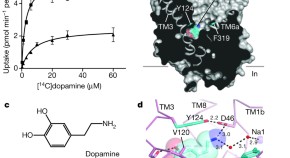 Here the X-ray crystal structures of the Drosophila dopamine transporter bound to dopamine, D-amphetamine, methamphetamine and cocaine are solved; these structures show how a neurotransmitter, small molecule stimulants and cocaine bind to a biogenic amine transporter, and are examples of how the ligand binding site of a neurotransmitter transporter can remodel itself to accommodate structurally unrelated small molecules that are different in shape, size and polarity or charge.