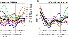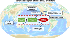 The 2023–2024 El Niño experienced two distinct spatial peaks of sea surface temperature anomaly in the equatorial central and eastern Pacific, with the central Pacific peak occurring in winter due to zonal advection and thermocline feedback, while the eastern counterpart matured in autumn, according to results from observational reanalysis data.