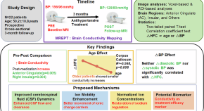 The study investigates brain conductivity changes following a three-month antihypertensive treatment in 22 patients with essential hypertension. Utilizing a prospective, cross-sectional design, the research employed MREPT for brain conductivity mapping. Image analyses involved voxel-based and ROI-based techniques with statistical tests examining correlations between conductivity changes and age or blood pressure changes. Key findings included a significant increase in brain conductivity post-treatment, particularly in the anterior cingulate and right insula. Older patients exhibited smaller conductivity increases, notably in the corpus callosum. No significant correlation was found between changes in diastolic or systolic blood pressure and conductivity. Proposed mechanisms for these changes include improved cerebrospinal fluid dynamics, enhanced ion mobility, and normalized ion concentrations, suggesting brain conductivity as a potential biomarker for treatment efficacy. The study implies that brain conductivity could serve as a novel imaging biomarker for monitoring antihypertensive treatment efficacy in the brain