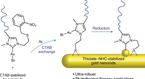 N-heterocyclic carbenes (NHCs) are valuable surface anchors, but their use has remained limited to either spherical or planar nanomaterials. Now, they have been grafted onto gold nanorods through a bidentate ligand featuring a thiolate and a NHC–gold complex. The resulting nanorods are robust towards a wide range of harsh conditions and show promise for photothermal therapy.