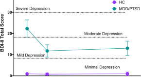 Lowered synaptic density is believed to occur in major depressive disorder and PTSD, possibly as an effect of stress. Here, the authors use positron emission tomography (PET) to measure levels of the synaptic marker SV2A and show that SV2A density is lower in those with more severe symptoms of depression.