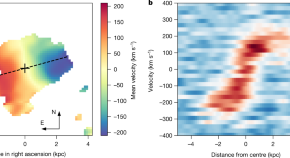 A two-dimensional spectroscopic investigation of a large, luminous filament of the cosmic web near QSO UM287 reveals that the brightest emission region is an extended rotating hydrogen disk with a velocity profile that is characteristic of gas in a 1013-solar-mass dark-matter halo, with a geometry that is strongly suggestive of cold flow accretion.