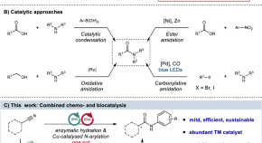 • Proteins, other metabolites and many valuable synthetic products contain amide bonds and there is a need for more sustainable amide synthesis routes. Here the authors show an integrated next generation multi-catalytic system, merging nitrile hydratase enzymes with a Cu-catalysed N-arylation reaction in a single reaction vessel, for the construction of ubiquitous amide bonds.