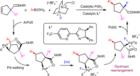 Many C–C bond activation methods involve strain-releasing cleavage of small rings to compensate for unfavourable kinetics and thermodynamics. Now, the 1,2-positional interchange of vicinal C–C and C–Pd bonds has been reported, giving access to quaternary carbon–palladium bonds. This dyotropic rearrangement has been used for the enantioselective synthesis of functionalized fluorinated cyclopentanes.