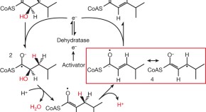 The pathogenic bacterium Clostridium difficile thrives by fermentation of L-leucine to ammonia, CO2, isovalerate, and isocaproate under anaerobic conditions. Ketyl radicals have been proposed to mediate a key reaction catalysed by an iron–sulphur cluster-containing dehydratase, which requires activation by ATP-dependent electron transfer from a second iron–sulphur protein. A kinetically competent product-related allylic ketyl radical bound to the dehydratase using electron paramagnetic resonance spectroscopy is identified. These results suggest that other 2-hydroxyacyl-CoA dehydratases (and the related benzoyl-CoA reductases) may employ ketyl radical intermediates. The absence of radical generators makes these enzymes unprecedented in biochemistry.