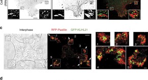 Although focal adhesions (FAs) and microtubules (MTs) are known to associate, the underlying regulation of this dynamic interaction is not understood. Here the authors discover that the CRL3KLHL21E3 ubiquitin ligase localises to FAs and ubiquitinates the MT plus-tip binding protein EB1, thereby promoting MT and FA dynamics and cell migration.